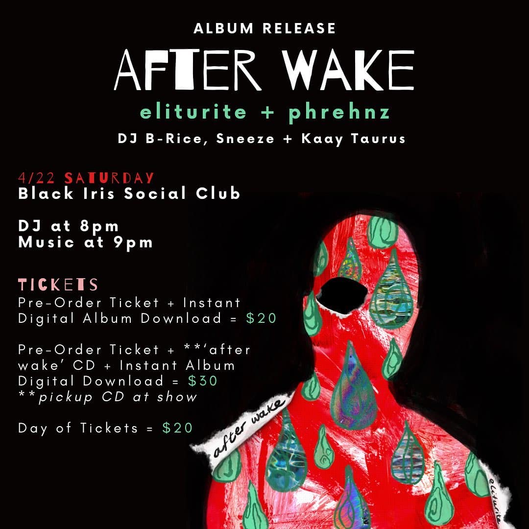 After Wake comes out Friday, April 21st on all streaming platforms and Eliturite is celebrating with an album release concert on Saturday, April 22nd at Black Iris Social Club. He’ll be joined by Sneeze, Kay Taurus, and DJ B-Rice with the doors opening at 8 PM and music starting at 9 PM. You can order tickets in advance, which can be bundled with a digital download of the album or a physical CD or cassette. For more information on the show, click here or view the show poster below.